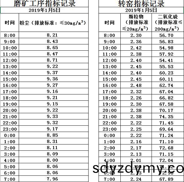 山東道恩鈦業(ye)股(gu)份有(you)限公(gong)司(si)2019年(nian)1月5日(ri)磨鑛(kuang)工序(xu)煙(yan)氣(qi)及轉窰煙(yan)氣指(zhi)標數(shu)據:山(shan)東道恩鈦業(ye)股(gu)份(fen)有(you)限(xian)公司(si)2019年(nian)1月5日(ri)磨鑛(kuang)工序(xu)煙(yan)氣及(ji)轉窰煙氣(qi)指(zhi)標(biao)數(shu)據: