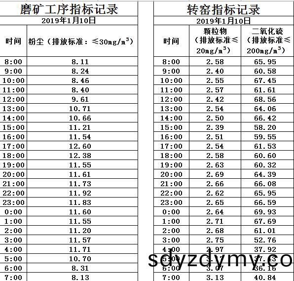 山(shan)東(dong)道恩(en)鈦業股(gu)份有限(xian)公(gong)司2019年(nian)1月(yue)10日(ri)磨鑛(kuang)工(gong)序煙氣(qi)及轉窰(yao)煙氣(qi)指標數(shu)據(ju):山東道恩(en)鈦業股(gu)份有限(xian)公司2019年(nian)1月(yue)10日(ri)磨鑛工序煙(yan)氣及轉窰煙氣(qi)指標(biao)數(shu)據: