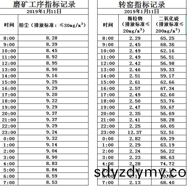 山(shan)東道恩(en)鈦(tai)業股份有(you)限(xian)公(gong)司(si)2019年1月(yue)11日磨鑛工(gong)序煙(yan)氣及轉窰煙(yan)氣指(zhi)標(biao)數據:山東道恩鈦(tai)業股(gu)份(fen)有限(xian)公司(si)2019年(nian)1月11日磨鑛(kuang)工(gong)序煙(yan)氣(qi)及轉窰煙氣(qi)指標數(shu)據: