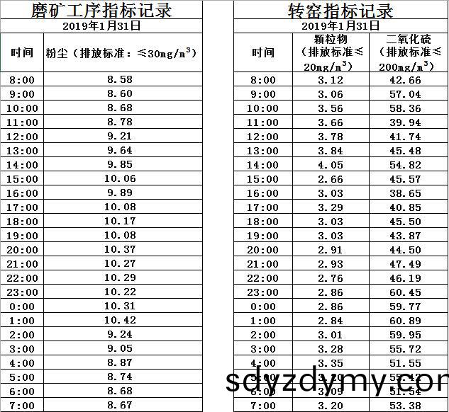 山(shan)東道恩鈦(tai)業股份(fen)有限(xian)公司2019年1月(yue)31日磨鑛工(gong)序煙(yan)氣及轉窰(yao)煙(yan)氣指標數據:山(shan)東(dong)道(dao)恩鈦(tai)業(ye)股(gu)份有限公司(si)2019年(nian)1月(yue)31日(ri)磨(mo)鑛工(gong)序(xu)煙氣及轉窰煙氣指標數據: