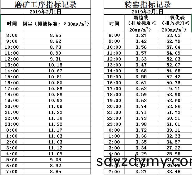 山東(dong)道恩鈦(tai)業股份(fen)有限(xian)公司(si)2019年(nian)2月1日磨鑛工(gong)序煙(yan)氣(qi)及轉窰煙氣指標(biao)數據:山(shan)東道恩(en)鈦業股(gu)份有(you)限(xian)公司2019年2月(yue)1日(ri)磨鑛工序(xu)煙氣(qi)及(ji)轉窰煙氣(qi)指標數據: