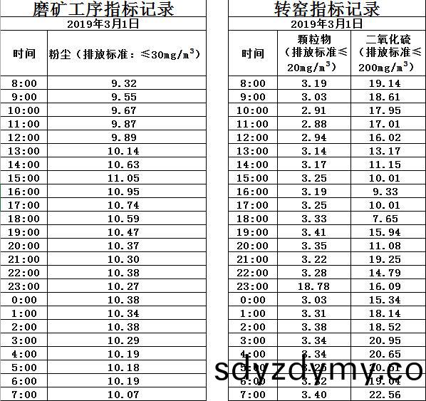 山(shan)東(dong)道(dao)恩(en)鈦業股份有限(xian)公司(si)2019年(nian)3月1日(ri)磨(mo)鑛(kuang)工(gong)序煙(yan)氣(qi)及轉(zhuan)窰煙(yan)氣指標(biao)數據(ju):山(shan)東道(dao)恩(en)鈦業(ye)股(gu)份(fen)有限公司(si)2019年(nian)3月1日磨(mo)鑛(kuang)工(gong)序(xu)煙(yan)氣及(ji)轉窰(yao)煙(yan)氣(qi)指標數(shu)據: