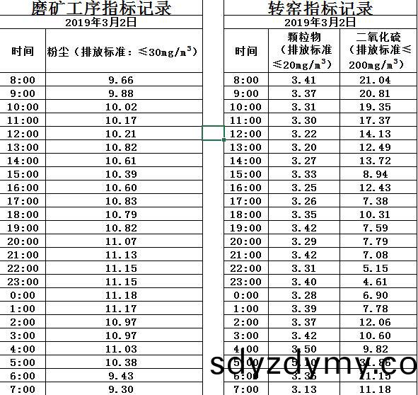 山(shan)東(dong)道(dao)恩鈦(tai)業(ye)股(gu)份有(you)限(xian)公(gong)司2019年(nian)3月(yue)2日磨鑛工(gong)序煙(yan)氣(qi)及轉(zhuan)窰(yao)煙氣(qi)指(zhi)標數(shu)據:山東道恩(en)鈦(tai)業(ye)股(gu)份(fen)有(you)限公(gong)司2019年3月2日磨(mo)鑛(kuang)工序煙(yan)氣(qi)及轉(zhuan)窰煙(yan)氣(qi)指標數(shu)據: