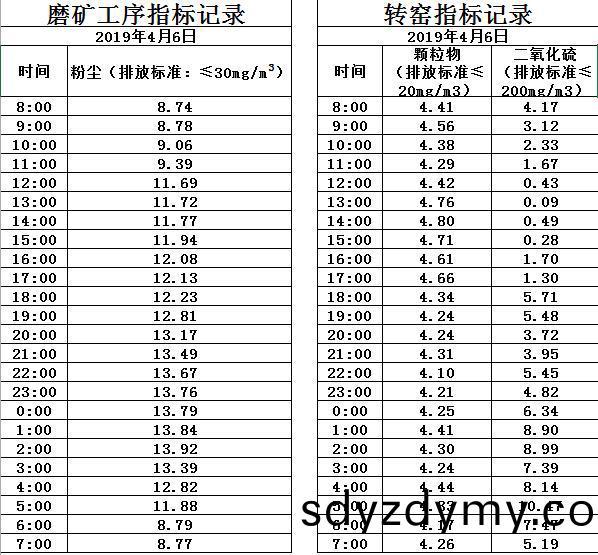 山(shan)東(dong)道恩鈦業股(gu)份有限公(gong)司2019年(nian)4月6日(ri)磨(mo)鑛(kuang)工(gong)序煙(yan)氣及轉窰煙氣指(zhi)標(biao)數據(ju):山東道(dao)恩鈦(tai)業股份(fen)有(you)限(xian)公司(si)2019年(nian)4月(yue)6日磨(mo)鑛工序煙氣(qi)及轉(zhuan)窰(yao)煙(yan)氣指(zhi)標(biao)數據(ju):