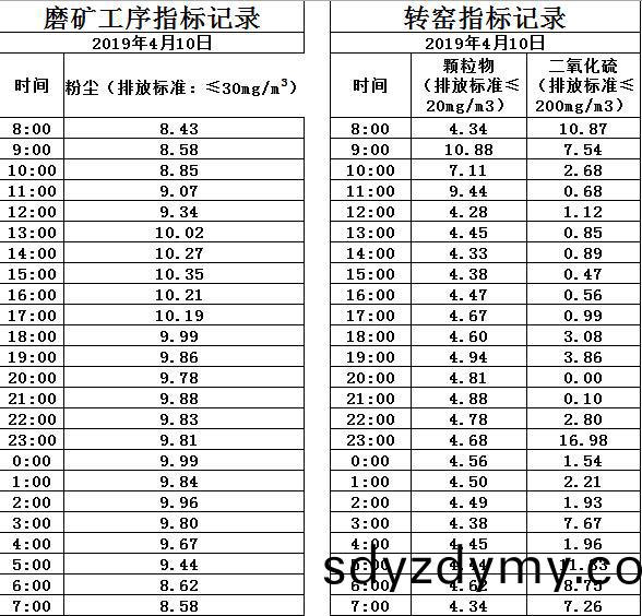山東道恩(en)鈦業股(gu)份有(you)限公(gong)司2019年(nian)4月(yue)10日(ri)磨鑛(kuang)工(gong)序煙(yan)氣及轉窰(yao)煙氣指標(biao)數據:山東(dong)道恩鈦(tai)業(ye)股(gu)份有限公(gong)司(si)2019年4月10日磨(mo)鑛(kuang)工序煙氣(qi)及(ji)轉(zhuan)窰煙(yan)氣(qi)指(zhi)標數據: