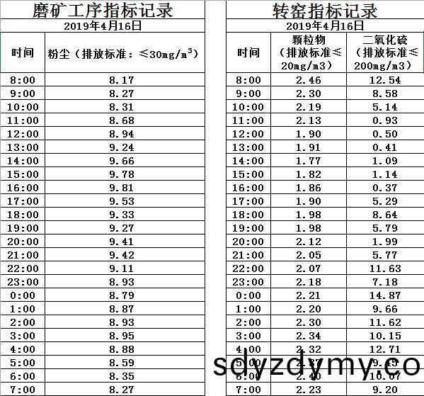 山東道恩(en)鈦(tai)業(ye)股份(fen)有限(xian)公司2019年(nian)4月16日(ri)磨(mo)鑛(kuang)工序煙(yan)氣(qi)及(ji)轉窰(yao)煙(yan)氣(qi)指(zhi)標數(shu)據:山東道(dao)恩(en)鈦(tai)業(ye)股(gu)份有(you)限(xian)公(gong)司(si)2019年(nian)4月(yue)16日磨(mo)鑛(kuang)工序煙氣及(ji)轉(zhuan)窰煙(yan)氣指標(biao)數據: