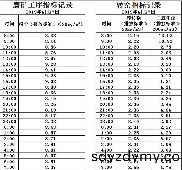 山(shan)東道恩鈦業股份(fen)有限公(gong)司(si)2019年(nian)4月17日(ri)磨(mo)鑛工序煙氣(qi)及轉(zhuan)窰煙(yan)氣指標數(shu)據:山東道恩(en)鈦業(ye)股(gu)份(fen)有限公(gong)司2019年4月(yue)17日磨鑛(kuang)工(gong)序(xu)煙氣及(ji)轉(zhuan)窰煙氣指標(biao)數(shu)據(ju):