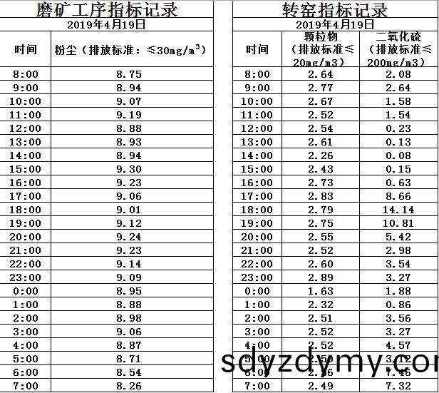 山(shan)東道恩鈦業股(gu)份有限(xian)公(gong)司(si)2019年(nian)4月19日(ri)磨鑛(kuang)工(gong)序煙氣(qi)及轉窰煙(yan)氣指(zhi)標數據:山(shan)東道(dao)恩鈦(tai)業(ye)股(gu)份(fen)有限(xian)公(gong)司2019年4月(yue)19日磨(mo)鑛(kuang)工序(xu)煙(yan)氣(qi)及(ji)轉(zhuan)窰煙氣(qi)指標(biao)數據: