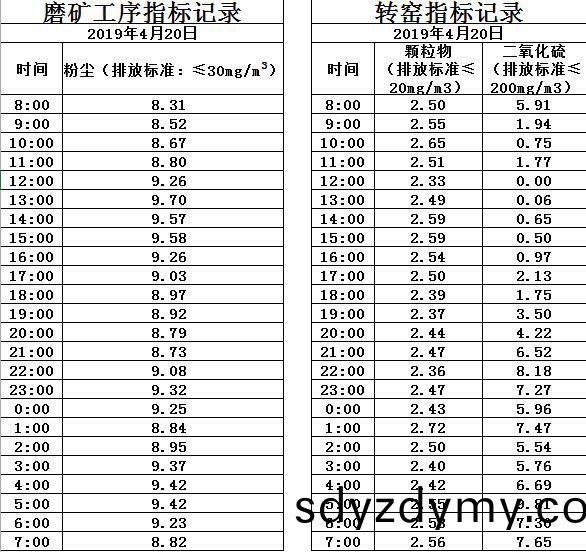 山(shan)東道(dao)恩鈦業股份(fen)有(you)限(xian)公司(si)2019年4月(yue)20日磨(mo)鑛工(gong)序煙(yan)氣(qi)及(ji)轉窰(yao)煙氣(qi)指(zhi)標(biao)數(shu)據(ju):山東道(dao)恩鈦業(ye)股(gu)份有限公(gong)司(si)2019年(nian)4月20日磨(mo)鑛(kuang)工(gong)序(xu)煙(yan)氣(qi)及轉窰(yao)煙氣指(zhi)標(biao)數據: