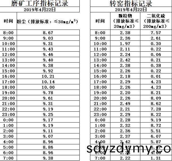山東道(dao)恩鈦(tai)業(ye)股(gu)份(fen)有(you)限公(gong)司2019年(nian)4月22日(ri)磨鑛(kuang)工(gong)序煙(yan)氣及轉(zhuan)窰煙氣(qi)指(zhi)標數(shu)據(ju):山東(dong)道(dao)恩(en)鈦(tai)業股份(fen)有限(xian)公司2019年4月(yue)22日磨鑛(kuang)工序煙(yan)氣及轉窰(yao)煙氣(qi)指標(biao)數據: