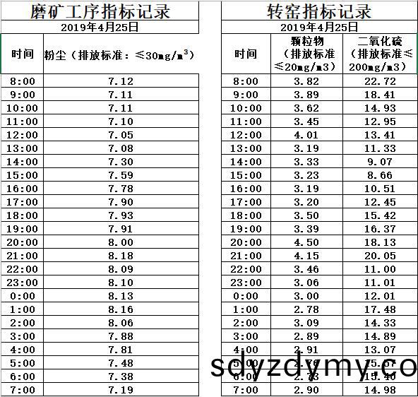 山(shan)東(dong)道(dao)恩鈦業(ye)股份有(you)限(xian)公(gong)司2019年4月(yue)25日(ri)磨鑛(kuang)工(gong)序(xu)煙氣(qi)及轉窰(yao)煙(yan)氣指(zhi)標(biao)數(shu)據(ju):山東道恩(en)鈦業股份有(you)限公司2019年(nian)4月25日(ri)磨鑛工(gong)序(xu)煙氣及(ji)轉窰(yao)煙氣(qi)指標數(shu)據(ju):