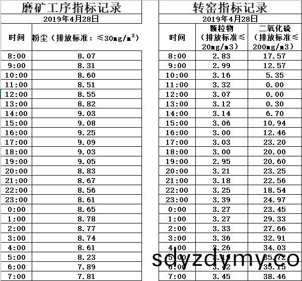 山(shan)東道(dao)恩鈦(tai)業股份有(you)限公(gong)司2019年(nian)4月(yue)28日(ri)磨鑛工序(xu)煙(yan)氣(qi)及(ji)轉(zhuan)窰(yao)煙氣指(zhi)標數(shu)據:山東道(dao)恩(en)鈦(tai)業股(gu)份(fen)有限公司2019年4月(yue)28日(ri)磨鑛(kuang)工(gong)序(xu)煙(yan)氣(qi)及轉窰煙(yan)氣(qi)指(zhi)標(biao)數據(ju):