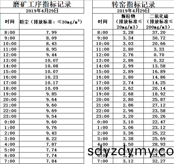 9山(shan)東道(dao)恩(en)鈦(tai)業(ye)股份(fen)有限(xian)公司(si)2019年4月(yue)21日磨(mo)鑛工序煙(yan)氣及轉窰(yao)煙(yan)氣(qi)指標數(shu)據(ju):山(shan)東(dong)道(dao)恩鈦(tai)業股(gu)份有限(xian)公司2019年(nian)4月(yue)29日磨(mo)鑛工(gong)序(xu)煙氣及轉(zhuan)窰煙(yan)氣(qi)指(zhi)標(biao)數據: