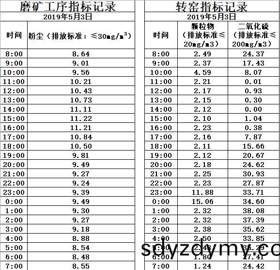 山東道(dao)恩(en)鈦業股份(fen)有限公(gong)司2019年(nian)5月3日磨鑛工序煙(yan)氣(qi)及(ji)轉窰煙(yan)氣(qi)指標(biao)數據(ju):山(shan)東(dong)道(dao)恩鈦業(ye)股(gu)份(fen)有限(xian)公(gong)司2019年5月(yue)3日(ri)磨鑛工(gong)序(xu)煙(yan)氣及(ji)轉窰(yao)煙氣指標(biao)數(shu)據(ju):