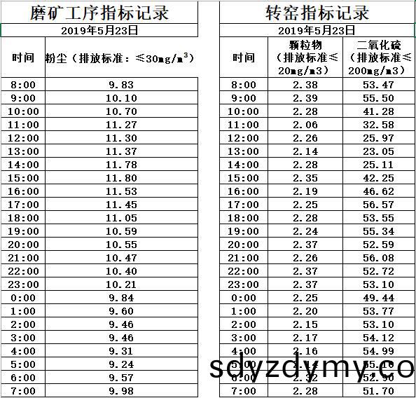 山(shan)東(dong)道(dao)恩(en)鈦(tai)業股(gu)份有(you)限(xian)公司(si)2019年5月(yue)23日(ri)磨(mo)鑛工序煙氣(qi)及轉(zhuan)窰煙(yan)氣指(zhi)標(biao)數據(ju):山(shan)東(dong)道(dao)恩鈦業股(gu)份(fen)有限公(gong)司2019年5月23日(ri)磨(mo)鑛(kuang)工(gong)序(xu)煙(yan)氣(qi)及轉(zhuan)窰煙(yan)氣(qi)指(zhi)標數(shu)據(ju):