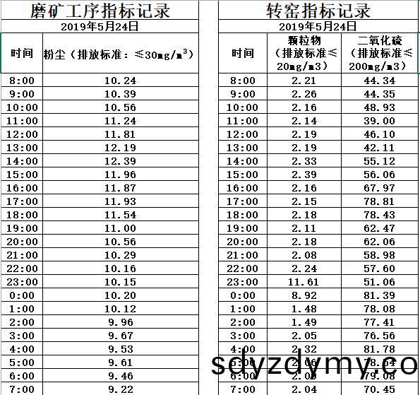 山(shan)東道(dao)恩鈦業股份(fen)有(you)限(xian)公(gong)司(si)2019年(nian)5月(yue)24日(ri)磨(mo)鑛(kuang)工(gong)序煙氣(qi)及(ji)轉(zhuan)窰(yao)煙(yan)氣(qi)指(zhi)標數(shu)據:山東道(dao)恩(en)鈦業(ye)股(gu)份有限公司2019年(nian)5月24日(ri)磨鑛(kuang)工序(xu)煙(yan)氣及(ji)轉(zhuan)窰(yao)煙(yan)氣指(zhi)標(biao)數(shu)據: