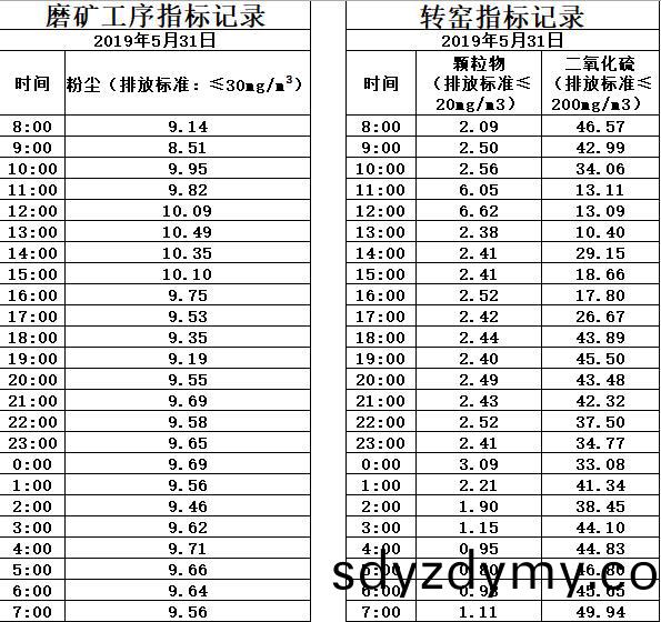 山(shan)東(dong)道恩(en)鈦業(ye)股(gu)份(fen)有限公司2019年5月(yue)31日磨(mo)鑛(kuang)工(gong)序(xu)煙氣及(ji)轉窰煙(yan)氣(qi)指(zhi)標數據:山東(dong)道(dao)恩鈦(tai)業股份有限(xian)公司(si)2019年(nian)5月31日(ri)磨(mo)鑛(kuang)工(gong)序(xu)煙(yan)氣及轉(zhuan)窰(yao)煙氣指(zhi)標(biao)數據(ju):