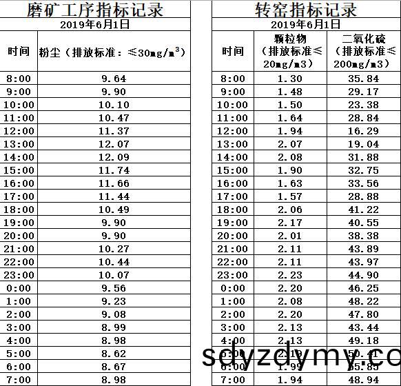 山(shan)東道(dao)恩鈦業股(gu)份(fen)有(you)限公(gong)司2019年(nian)6月1日(ri)磨(mo)鑛(kuang)工(gong)序(xu)煙氣及轉(zhuan)窰煙(yan)氣(qi)指(zhi)標(biao)數據:山東道(dao)恩鈦業股(gu)份有限公司(si)2019年(nian)6月1日磨鑛(kuang)工(gong)序(xu)煙氣(qi)及轉窰(yao)煙(yan)氣(qi)指(zhi)標數(shu)據: