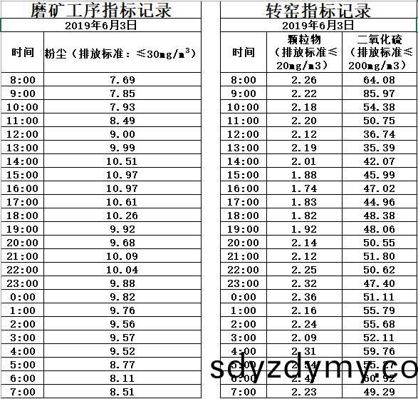 山(shan)東道恩鈦業股(gu)份有(you)限(xian)公(gong)司2019年6月(yue)3日磨鑛(kuang)工(gong)序(xu)煙(yan)氣及轉窰煙(yan)氣指(zhi)標(biao)數(shu)據:山(shan)東(dong)道恩(en)鈦(tai)業(ye)股(gu)份有限(xian)公(gong)司2019年(nian)6月(yue)3日磨(mo)鑛工序(xu)煙(yan)氣(qi)及(ji)轉窰煙氣(qi)指(zhi)標(biao)數(shu)據:
