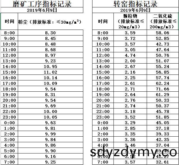山(shan)東道(dao)恩(en)鈦(tai)業(ye)股份有(you)限公司(si)2019年6月(yue)9日(ri)磨鑛工序煙(yan)氣(qi)及轉(zhuan)窰(yao)煙(yan)氣(qi)指(zhi)標(biao)數據(ju):山(shan)東(dong)道恩(en)鈦(tai)業股份(fen)有限(xian)公司(si)2019年(nian)6月9日(ri)磨鑛(kuang)工(gong)序(xu)煙氣及(ji)轉窰(yao)煙氣(qi)指標(biao)數據:
