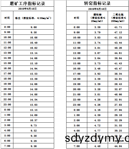 山東道恩鈦業(ye)股(gu)份(fen)有(you)限公司2019年(nian)6月(yue)18日磨鑛(kuang)工序煙(yan)氣(qi)及轉窰煙氣指(zhi)標數(shu)據(ju):山東道(dao)恩鈦(tai)業(ye)股份(fen)有(you)限(xian)公司(si)2019年(nian)6月(yue)18日(ri)磨(mo)鑛(kuang)工(gong)序(xu)煙(yan)氣及轉窰(yao)煙氣指標(biao)數據: