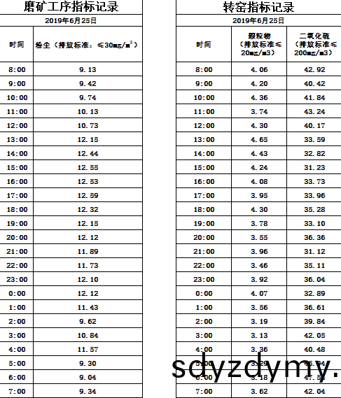 山東(dong)道(dao)恩(en)鈦(tai)業股(gu)份有(you)限公(gong)司(si)2019年(nian)6月(yue)25日磨(mo)鑛(kuang)工序(xu)煙(yan)氣及(ji)轉(zhuan)窰(yao)煙氣(qi)指(zhi)標(biao)數(shu)據(ju):