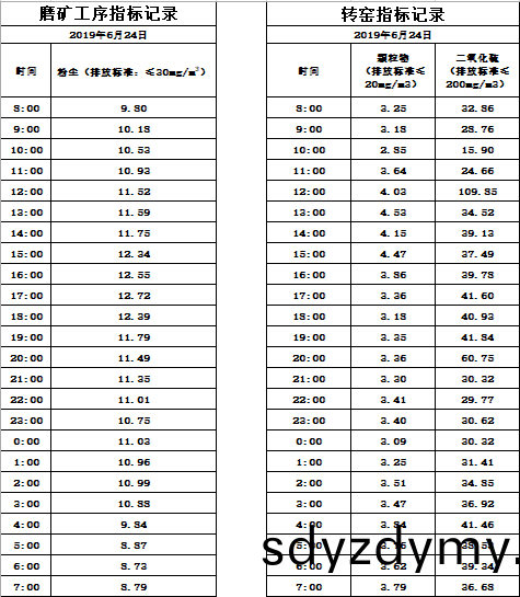 山(shan)東(dong)道(dao)恩(en)鈦業股份(fen)有(you)限(xian)公(gong)司2019年(nian)6月(yue)24日(ri)磨鑛工序(xu)煙氣(qi)及轉窰(yao)煙(yan)氣指(zhi)標數據(ju):山東道恩鈦(tai)業(ye)股份有(you)限(xian)公(gong)司2019年(nian)6月(yue)24日(ri)磨鑛(kuang)工(gong)序煙氣(qi)及轉窰煙氣(qi)指標數(shu)據(ju):
