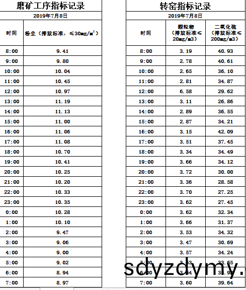 山東道(dao)恩(en)鈦(tai)業(ye)股(gu)份(fen)有(you)限(xian)公(gong)司2019年(nian)7月(yue)8日(ri)磨鑛(kuang)工(gong)序(xu)煙(yan)氣及(ji)轉(zhuan)窰(yao)煙氣(qi)指標(biao)數(shu)據(ju):山東(dong)道(dao)恩鈦業股(gu)份(fen)有限公(gong)司2019年7月(yue)8日(ri)煙(yan)氣(qi)數據