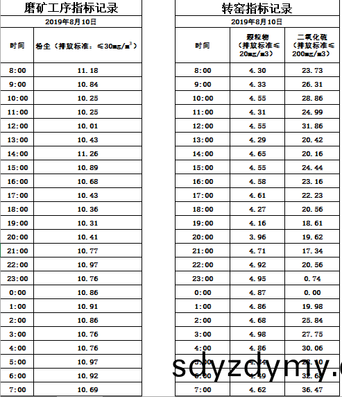 山(shan)東(dong)道恩(en)鈦業(ye)股份(fen)有(you)限(xian)公司(si)2019年8月(yue)10日磨(mo)鑛(kuang)工(gong)序(xu)煙(yan)氣(qi)及轉(zhuan)窰(yao)煙氣(qi)指標(biao)數(shu)據:山(shan)東(dong)道恩(en)鈦(tai)業股份有限(xian)公司2019年(nian)8月10日煙氣(qi)數據