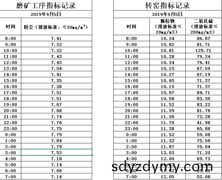 山(shan)東(dong)道(dao)恩(en)鈦業(ye)股份有(you)限(xian)公(gong)司(si)2019年(nian)9月(yue)5日(ri)磨(mo)鑛(kuang)工序(xu)煙(yan)氣(qi)及(ji)轉窰(yao)煙氣指(zhi)標數據(ju):山東(dong)道(dao)恩(en)鈦(tai)業股(gu)份有限公司2019年9月(yue)5日(ri)煙(yan)氣數據