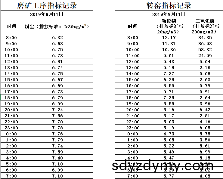 山東道(dao)恩鈦(tai)業股份有(you)限公(gong)司2019年(nian)9月(yue)11日磨鑛(kuang)工序(xu)煙(yan)氣及(ji)轉窰煙氣(qi)指(zhi)標數據:山東道恩(en)鈦(tai)業股(gu)份有限(xian)公司(si)2019年(nian)9月11日煙(yan)氣(qi)數(shu)據