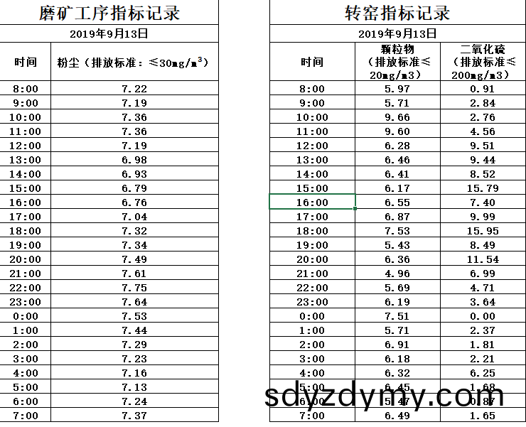 山東道恩(en)鈦業股(gu)份有限(xian)公司(si)2019年9月(yue)13日磨鑛(kuang)工(gong)序(xu)煙(yan)氣及轉(zhuan)窰煙(yan)氣(qi)指標數(shu)據:山(shan)東(dong)道恩(en)鈦(tai)業(ye)股(gu)份(fen)有限公司2019年(nian)9月13日煙(yan)氣數(shu)據