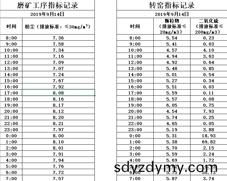 山東道(dao)恩鈦(tai)業(ye)股份有限(xian)公司(si)2019年(nian)9月14日(ri)磨鑛工(gong)序(xu)煙(yan)氣(qi)及轉窰煙氣指標(biao)數據:山(shan)東(dong)道恩(en)鈦業股份有(you)限公(gong)司2019年9月(yue)14日煙氣數據(ju)