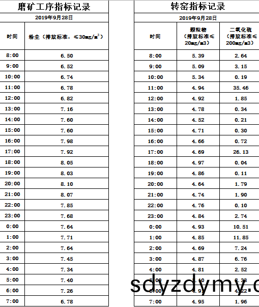 山(shan)東(dong)道恩鈦業(ye)股份有(you)限(xian)公(gong)司2019年9月(yue)28日(ri)磨(mo)鑛工(gong)序煙氣(qi)及(ji)轉(zhuan)窰(yao)煙氣(qi)指標數(shu)據(ju):山東道(dao)恩(en)鈦(tai)業(ye)股份有限(xian)公司2019年(nian)9月(yue)28日(ri)煙氣數(shu)據(ju)