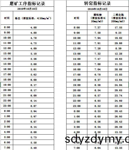 山(shan)東(dong)道恩(en)鈦(tai)業股(gu)份有(you)限(xian)公司2019年(nian)10月10日(ri)磨鑛工序(xu)煙(yan)氣及轉窰(yao)煙(yan)氣指標(biao)數據:山東(dong)道恩鈦(tai)業(ye)股份有限(xian)公(gong)司(si)2019年10月10日煙氣數(shu)據(ju)